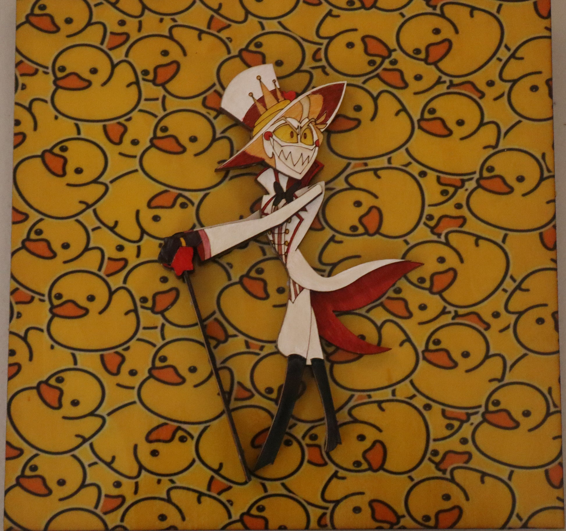 Multilayer wood art based on Lucifer from Hazbin Hotel. He available in an 8X10 or 8X8 frame.